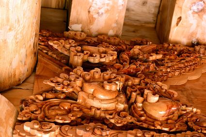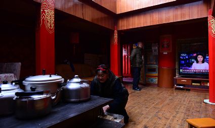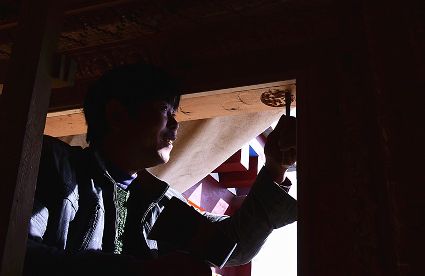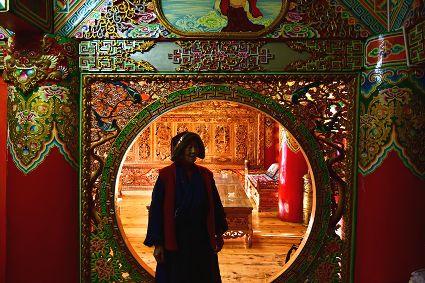 道孚民居的精華在其內(nèi)部,木材是其唯一的內(nèi)部裝飾材料,而裝飾,是一項(xiàng)繁瑣得曠日持久的藝術(shù)勞作,往往建房只需一兩個(gè)月,內(nèi)部裝飾則要幾年甚至幾十年。民間建筑藝術(shù)家們沉醉在細(xì)致入微的勞作里,讓每一個(gè)圖案都盈溢一份心底的吉祥,讓每一筆描摹都傳遞一份動(dòng)人的傳說(shuō)。房間四壁、房門(mén)和梁柱上一般都繪滿(mǎn)了精致典型的藏式壁畫(huà),窗上分別雕刻著龍、鳳、仙鶴、麒麟等吉祥圖案。每間屋的大門(mén)上都鑲嵌醒目的兩個(gè)獅頭大銅環(huán),凸顯了與之相融的漢文化的特點(diǎn)。置身其間,色彩斑斕中,身邊盡是龍飛鳳舞,鶴翔麟躍。繽紛中細(xì)端詳,真是藏民族藝術(shù)的天堂!