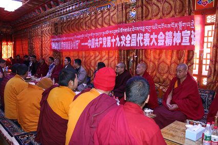 宣講團(tuán)成員勇勇用藏語激情洋溢的宣講黨的十九大精神,現(xiàn)場不斷響起熱烈的掌聲。當(dāng)勇勇講到我國五年來取得的輝煌成就時,僧人們都激動不已,紛紛為發(fā)展成就點(diǎn)贊?!奥犃私裉斓男v,我進(jìn)一步了解到了我們國家這些年來取得的發(fā)展成就。一直以來,黨對我們的關(guān)懷是看得見摸得著的,現(xiàn)在我們的寺廟管理越來越規(guī)范,基礎(chǔ)設(shè)施也得到了完善,通往寺廟的道路也有了明顯改善,我們的生活越來越好了,這一切都是共產(chǎn)黨的功勞。”寺廟僧人尺乃表達(dá)著對黨的感恩。