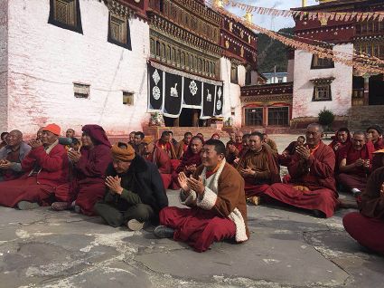 當(dāng)宣講組一行來到郭沙寺時,寺廟僧人們早已迫不及待的等候在寺廟外。“聽說你們今天要來,我們?nèi)律舷露己芨吲d、很期待。”寺廟堪布甲它激動地說。