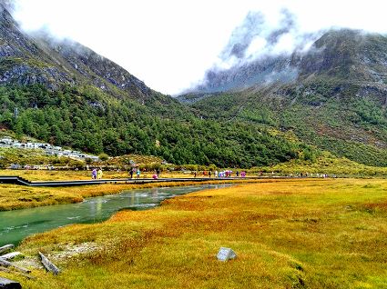 燦爛的陽光伴隨幾場秋雨秋霜過后,亞丁的秋天便更加絢麗多彩,漸黃的草地和青楊林開始爭奇斗艷,稻城的美變得更加富有層次,幾乎是一天一個變化,一天一個景色。山與水、人與情,一步一勝境。大片大片的高原草甸現在已經逐漸變?yōu)辄S綠色,環(huán)抱高原海子的水草也由養(yǎng)眼的綠色向迷人的金色過渡。藍天白云、金色草甸、紅楓映白樺、秋水繞山間,幽靜的小徑,融合了感性的色彩和理性的沉靜,既有成熟的風韻,又有灑脫的禪境。木質棧道以“曲徑通幽”的姿態(tài)環(huán)景分布,所經之地為負氧離子含量相對較高的森林區(qū)域,漫步林中,令人心曠神怡。無論是傳統(tǒng)的團隊游,還是個性化的自助游、自駕游,在這里都能找到屬于自己的那份愉悅。