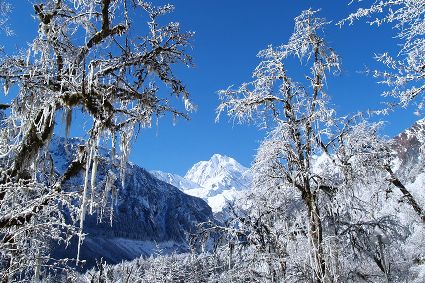 還留在枝頭上的綠色已被簇簇白雪點(diǎn)綴著,銀色的薄霧一重一重,遠(yuǎn)處雪峰皚皚,冰川閃爍、青山融融、波光粼粼。