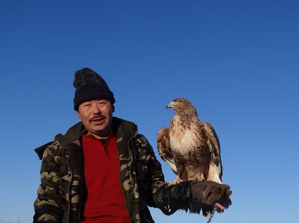 “小一點的鷹好訓(xùn),訓(xùn)老一點的叫熬鷹。 開始熬鷹前,一次性喂飽鷹,七天七夜不吃不喝不睡覺,待七天時到,放鷹于空,手中拿肉,用我們倆特殊的交流方式指揮它,這時它會落我的手臂上。但是,這一只始終沒服過我。訓(xùn)出來一只大約半月左右?!庇?xùn)鷹人說。