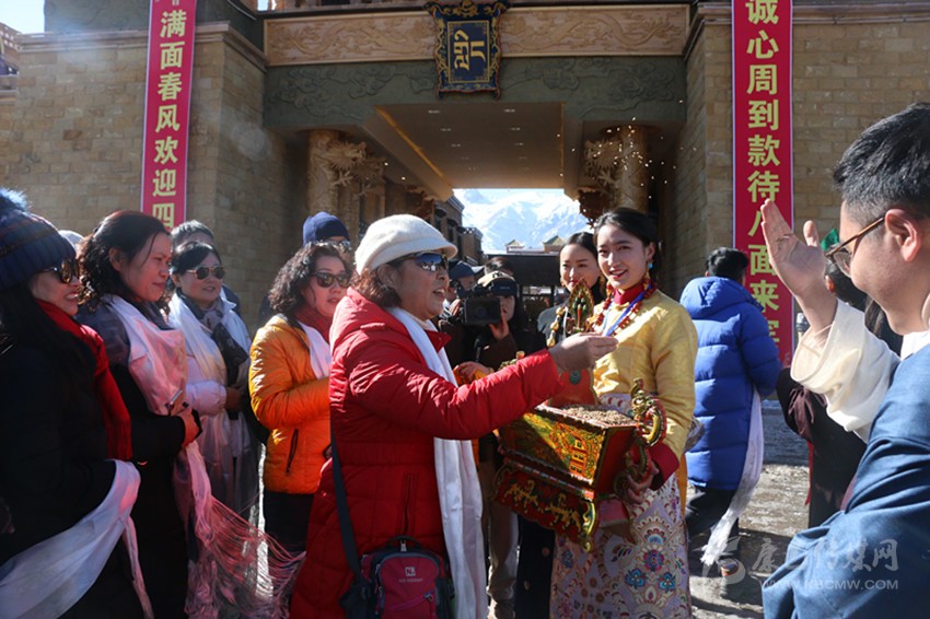 游客們剛到格薩爾王城門口就滿滿地感受到了當?shù)厝嗣竦臒崆?,“嶺國四位大將”和“格薩爾王王妃”盛裝在城門口擊鼓迎接遠道而來的客人們,為他們獻哈達、敬青稞酒,帶領大家轉煨桑爐祈福,在切瑪盒前體驗灑青稞和糌粑祈福儀式。隨后,游客們在王城體驗了喝圣水、祈福、騎馬、射箭等項目。王城內(nèi)宏偉的建筑,獨特的文化魅力,優(yōu)質(zhì)的服務質(zhì)量,讓遠道而來的游客贊不絕口。