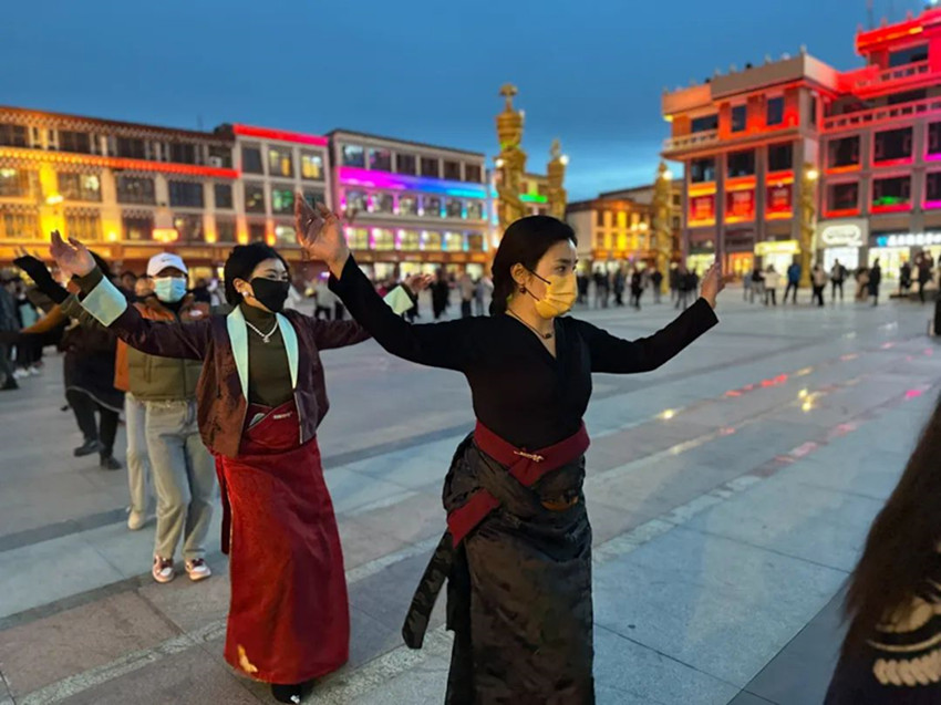 本網(wǎng)訊 每到傍晚時(shí)分,色達(dá)的金馬廣場上都會(huì)準(zhǔn)時(shí)響起起歡快的鍋莊曲。 舞者們雙手隨音樂自然張開,邁著輕快的步伐,踢腿、揚(yáng)手、轉(zhuǎn)圈。游客們有的拿起手機(jī)拍照留念,有的則加入鍋莊舞的隊(duì)列。