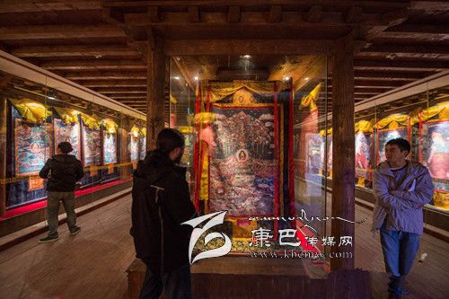 11月11日,幾位游客在爐霍縣博物館里觀賞郎卡杰唐卡精品。