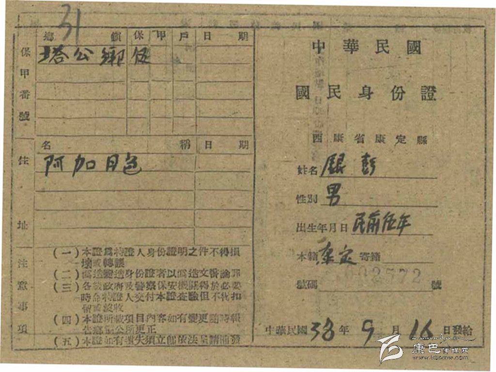 民國(guó)33年,即1944年,西康省民政廳制定《康區(qū)戶(hù)口清查辦法》,決定正式清查西康全省戶(hù)口。民國(guó)35年,即1946年,康定縣政府對(duì)康定全縣人口進(jìn)行統(tǒng)計(jì)。在1946年時(shí)候,全康定縣共8622戶(hù)、36797人,其中男性20889人、女性15908人(不含后重新劃歸康定管轄的所謂“金湯自治局”部分)。爾后開(kāi)始發(fā)放“國(guó)民身份證”。發(fā)放工作斷斷續(xù)續(xù),延續(xù)數(shù)年,有的人領(lǐng)到,也有的人根本就沒(méi)看到過(guò)這種“國(guó)民身份證”。