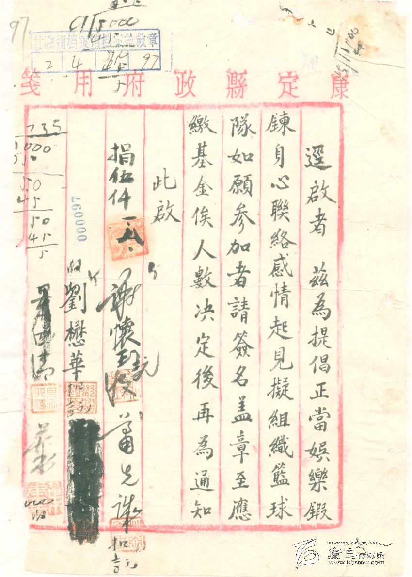 這是一張用解放前的康定縣政府便箋寫(xiě)的“啟事”,內(nèi)容是倡議成立一支籃球隊(duì)。在上面簽字的有十多個(gè)人,這十多人一定是籃球運(yùn)動(dòng)的愛(ài)好者。至于這支籃球隊(duì)后來(lái)是不是成立等等都不見(jiàn)下文。而且,從這張“啟事”上看不到這件事發(fā)生在哪一年,只有一位名叫李培清的人寫(xiě)下了收到捐款5700元、“三月三十日”的日期。最有意思的就是,在這張“啟事”上記下了的這句話:縣長(zhǎng)捐購(gòu)籃球款伍仟元。這句話起碼包涵了以下的意思,一,康定城里已經(jīng)興起了籃球運(yùn)動(dòng);二,成立籃球隊(duì)沒(méi)有專門的經(jīng)費(fèi),幸好人們有很高的積極性,連縣長(zhǎng)也主動(dòng)捐款,那些簽名后面隱約可見(jiàn)的數(shù)字也可能是捐款的數(shù)字。