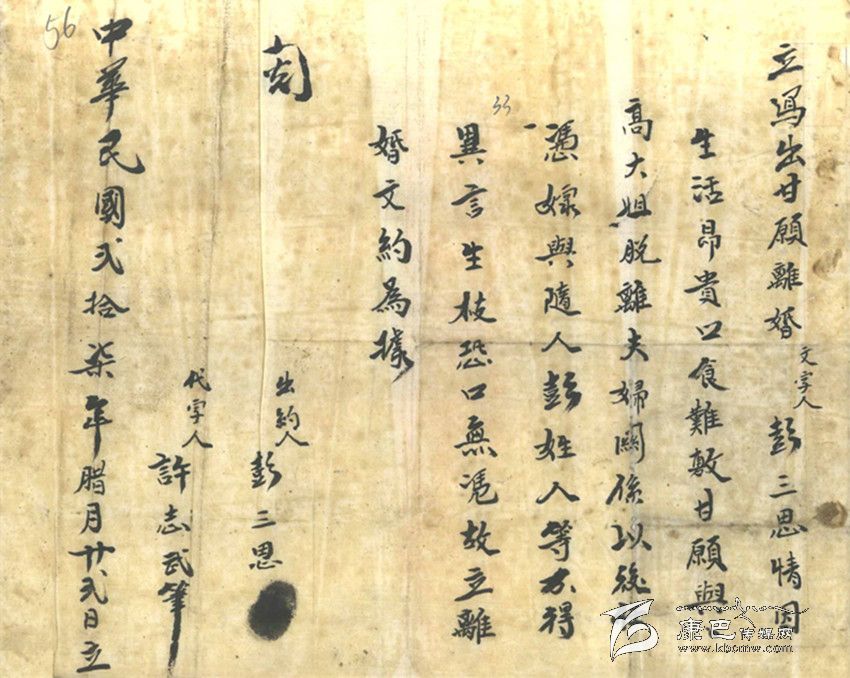 在這張“離婚文約”上看不出女方的任何態(tài)度和意愿,她仿佛只是一個影子,沒有了光源,影子也就不會存在。這位姓彭的男子雖是窮極潦倒之輩,身處社會底層,卻還是擁有對更為弱勢的曾經(jīng)是自己的妻子“要還是不要”或者是“放與不放”的特權(quán)。