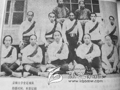 這是一張上個世紀初藏族人同英國人美國人在康巴高原踢足球的照片,地點是在川藏茶馬古道上的巴塘境內,從巴塘越過金沙江就是西藏地界。同樣的時間,京師大學堂(北京大學前身)建制完整的足球隊也為后人留下了一張同樣珍貴的合影照。