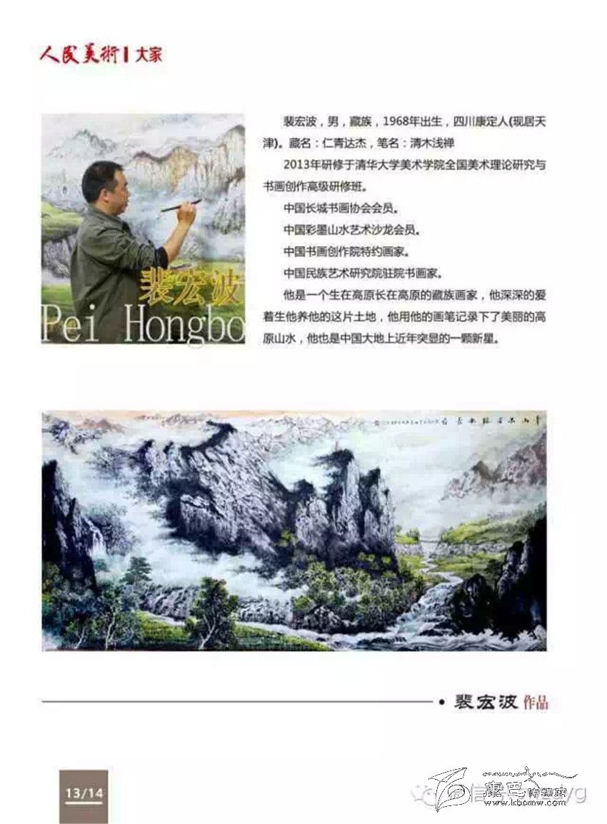 《人民美術(shù)》是中國(guó)最具權(quán)威的美術(shù)雜志、國(guó)家核心美術(shù)雜志和美術(shù)界最高學(xué)術(shù)雜志,由《人民日?qǐng)?bào)》社主管。雜志社對(duì)裴宏波及其作品給予了高度評(píng)價(jià),認(rèn)為藏族畫家裴宏波的作品極具生命力,在中國(guó)美術(shù)史上又有了新的突破,富有民族性、地域性、創(chuàng)造性、歷史性,最終決定列選為中國(guó)大家。雜志中裴宏波排在劉大為、曹雕、劉文西等之后。