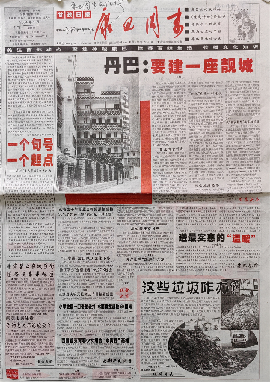 經(jīng)過緊鑼密鼓的籌措后,2004年1月3日,也就是在《甘孜報》正式改為《甘孜日報》的第三天,第一期《康巴周末》與讀者見面了?!犊蛋椭苣穭?chuàng)刊號的報頭是時任《甘孜日報》社副總編輯胡慶和先生書寫的,同時還配發(fā)了我撰寫的題為《一個句號、一個起點》的發(fā)刊詞。創(chuàng)刊號第一版推出的是周末新聞版,當(dāng)期與讀者見面的欄目包括:周末頭條、社會之窗、直通康定、現(xiàn)場目擊、康巴茶館、西部新聞拼盤等;第二版為周末綜合版,推出的是案例拾萃、健康文本欄目;第三版為周末綜合版,推出的是文化廣場欄目;第四版為天下版,推出的是國內(nèi)外奇聞逸事。此外,《康巴周末》創(chuàng)刊伊始,還推出了有獎?wù)骷侣劸€索活動,凡是提供有一定新聞價值的社會新聞,經(jīng)采訪核實后,都會給予線索提供者一定獎勵。這種線索征集活動,不但擴大了新聞源,還在一程度上為《康巴周末》迅速贏得讀者的青睞起到了推波助瀾的作用。直到后來在舉辦《康巴周末》創(chuàng)刊一百期活動時,讀者還對此給予了充分肯定。