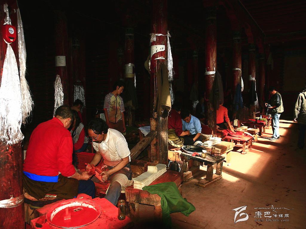 德格印經(jīng)院的各種傳統(tǒng)產(chǎn)業(yè),當(dāng)?shù)鼐用竦纳a(chǎn)勞動都立足于當(dāng)?shù)刈匀画h(huán)境資源,并且全面地支持著傳統(tǒng)印刷技術(shù)系統(tǒng)的各階段。包括“瑞香狼毒”的草根造紙方法,均與德格地區(qū)的傳統(tǒng)產(chǎn)業(yè)有關(guān)。藏紙是當(dāng)?shù)鼐用裼脗鹘y(tǒng)手工方式制造的印刷紙,是用一種叫“阿交如交”(瑞香狼毒)草本植物根須為原料制造而成。這種紙的顏色微黃,質(zhì)地較粗厚,但纖維柔軟,不易脆,吸水性強,同時還具有防蟲蛀、防鼠咬,久藏不壞的特點。印經(jīng)院的印刷用色通常分為紅版和墨版兩種。木刻印版的刻制工作更為艱辛,印經(jīng)院選聘藏文知識高深淵博的名士將所要刻制的圖書進行嚴(yán)格細致的三級審校,才可由聘請的藏文書法技藝精深的學(xué)者嚴(yán)格按照藏文書法正楷要求開始橫版書寫工作,他們將圖文描繪在半透明的薄紙上反貼在板面上。刻工們依據(jù)紙上的色差進行刻制,刻完后編師們在清樣上還要進行三校,版面改動較多的必須進行重刻,一般的進行補刻。直至完全準(zhǔn)確無誤時將印版放在酥油里浸泡一天后,取出曬干,再用一種名叫“蘇巴”的植物根熬水洗凈曬干,至此一塊印版的制作才算全部完成,可入庫上架和進行印刷。通常情況下,技藝嫻熟的一名工人每天完成一張書版的單面刻制,畫版刻制工作量更大。雕刻技工都是來自本地及周邊地區(qū)的民間藝人。