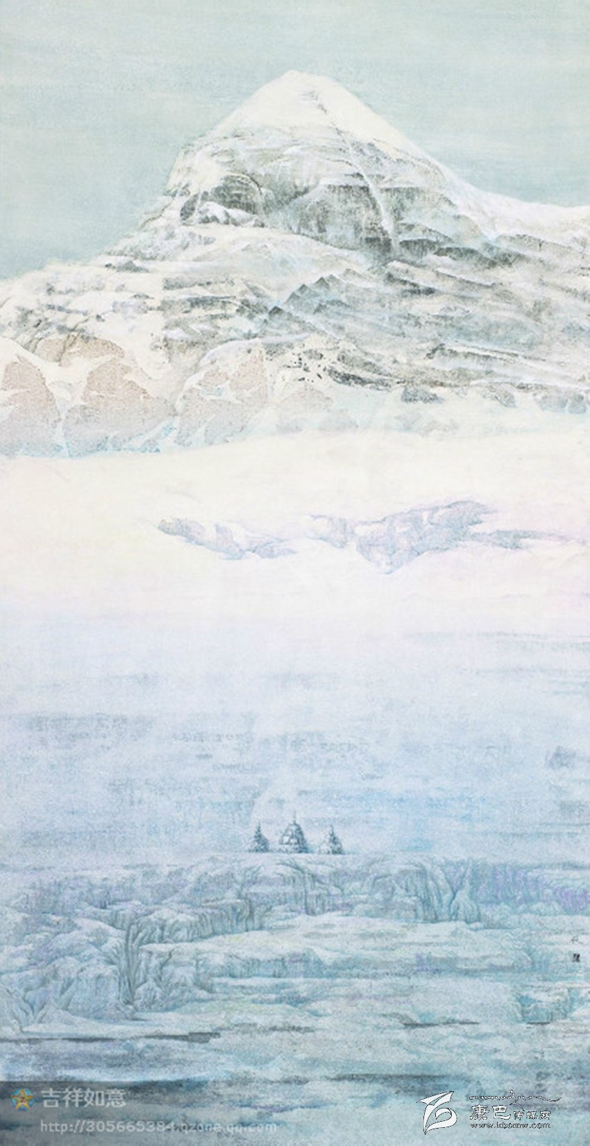 最后創(chuàng)作出了這張作品:神圣的岡仁波齊,您是世界中心;巍巍頂上是幾千年來,帝釋天的居所;山下積雪皚皚,在滿是瑪尼的巖壁下,是象征佛、法、僧的三座石塔,又宛如你忠實(shí)的信徒正在對你娓娓述說、虔誠祈禱。時間的河流,正在您腳下寂靜、流逝、封凍。