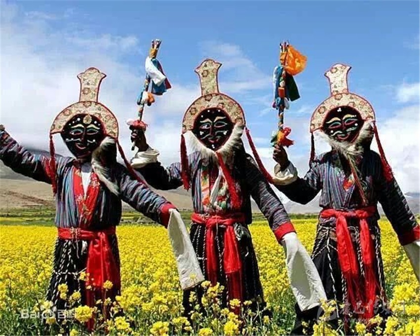 第三部分,被稱為“扎西學(xué)”。頭戴白羊皮面具,面部呈黃色的演員們是吉祥老人的化身。他們雖然老態(tài)龍鐘,但動(dòng)作卻輕盈無比。其裝束除了腰間纏繞的“子體”未掛五色彩綢外,與“溫巴”別無二致。他們?cè)跉g樂的舞動(dòng),向眾人賜福吉祥。