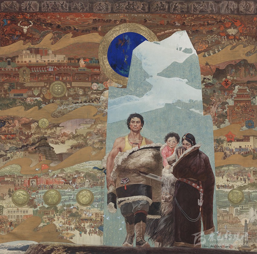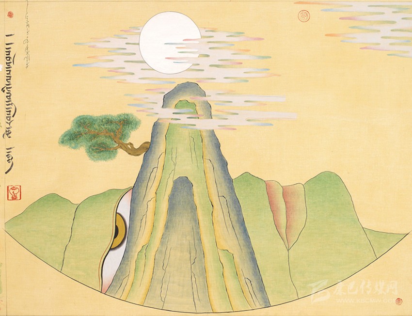 15世紀以來,唐卡發(fā)展所恒定的兩個元素:一是平面構圖的神佛之境,另一則是吸收大青綠山水精髓。正如DNA鏈的雙螺旋結構一般,使唐卡繪畫在歷史時空中穿插縈繞,在雪域各地生根開花。到了公元20世紀初,照片的高度寫實促使藏地畫家邁出了革新步伐,使得唐卡繪畫逐漸擺脫傳統(tǒng)束縛,開啟了“人”的覺醒。衛(wèi)藏地區(qū)出現(xiàn)了“根敦群培、安多強巴”引入寫實主義的嘗試,成為當今西藏“布面重彩”的先驅。新中國成立后,內地的美術創(chuàng)作積極影響了三大藏區(qū)的繪畫發(fā)展,上世紀80年代,四川康區(qū)“甘孜藏畫”肇起,在《嶺·格薩爾王》人文主義的召喚下,《雪山兒女》《唐東杰布》《新概念唐卡》正從歷史深處一路走來。而近年來,安多藏區(qū)則創(chuàng)新出了“藏族祥巴版畫”,祥巴版畫不僅是從材料技法上對西藏繪畫的豐富,更是藏地畫家們在自覺不自覺的求新、求變;甚至在傳統(tǒng)唐卡領域,民間畫師也都在紛紛嘗試將傳統(tǒng)唐卡和現(xiàn)代審美相結合。這一切,正是唐卡繪畫從傳統(tǒng)走向現(xiàn)代、由宗教博衍至生活的演變過程,在這個過程里,藏地畫家不僅在畫面的形式和語言上完成了傳統(tǒng)與當代的統(tǒng)一,還將西藏的審美特質虹化為作品的精神內核。這也是唐卡藝術第二次“從香巴拉到人間”的過程,成為民族文化發(fā)展的新坐標。