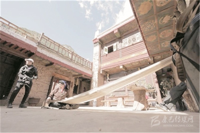 藍(lán)藍(lán)的天空下,成群的牦牛散落在草場(chǎng)上吃草。在一派祥和的氣氛中,傳來一陣清亮的歌聲。拉姆的媽媽和哥哥扎西,正在腌制著香豬腿。