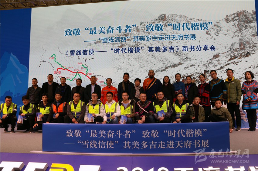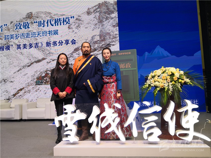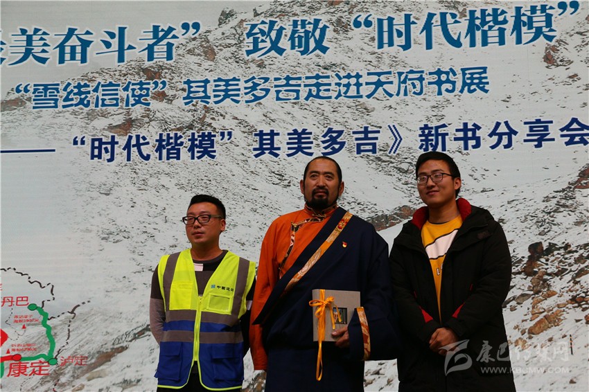 在分享會舞臺的一側(cè),靜置著書籍《雪線信使——“時代楷模”其美多吉》放大后的封面。封面上,其美多吉、藍(lán)天與雪山相得益彰,構(gòu)成了一幅獨具特色的畫面。