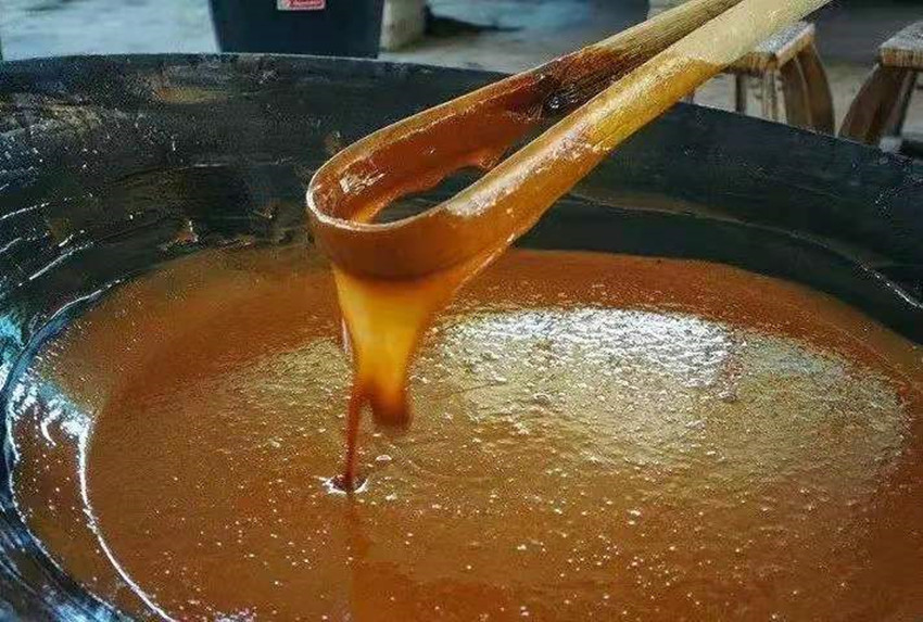 姐姐做好了午飯,我也完成了燒火任務。母親退掉了灶里燃燒的柴火,留下猩紅的火炭,將一瓢早已準備好的麥芽漿倒入煮好的漿糊中,加水攪拌均勻后靜置。直到吃完午飯,我們即將出發(fā)去大伯家時,我看到鍋里的漿糊上面析出一層透明的液體。此時母親又點燃了灶火繼續(xù)熬煮兩鍋漿糊,煮開后進行過濾。再將濾出的糖水倒入洗凈的大鍋中熬煮。
