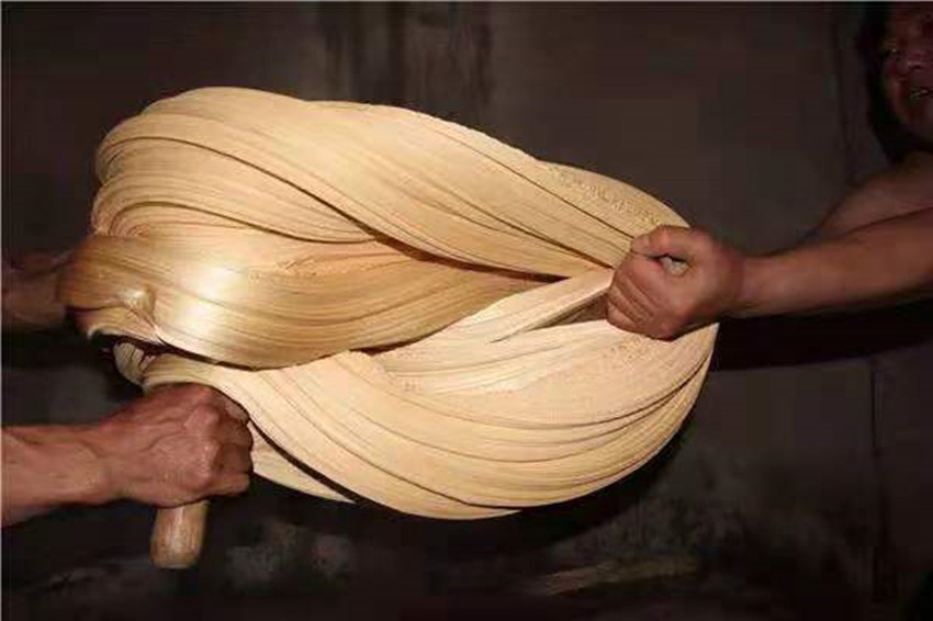 扯糖也是熬糖過程中十分關鍵的一個環(huán)節(jié)。剛出鍋的糖溫度可達兩三百度,徒手是不敢去觸碰的,扯糖需等到麻糖變得溫熱才能進行,但又必須在它完全冷卻之前完成整個扯糖工序,否則等麻糖徹底冷卻就會變得僵硬無比。休息少頃,只見三叔熟練的用粘著面粉的手從盛放麻糖的簸箕中扯下三四斤左右的一團麻糖,左手拿糖右手持杖(類似于搟面杖的木棍)作出扯糖的姿勢,此時四叔拿著早已準備好的沾了面粉的木棍將三叔的手中的麻糖攔腰別住,用力均勻的拉扯麻糖,三叔則在原地扎樁站穩(wěn),一手持杖作拉扯狀,一手微微扶住想要往下掉的糖尾,經(jīng)過幾次折疊和來回拉扯,麻糖變得均勻細長,兩人合力將扯好的麻糖平穩(wěn)的放在鋪有熟面粉的大簸箕中靜待冷卻。間隙二叔和父親又重復著扯糖的動作,很快將一團糖餅扯成糖帶。經(jīng)過拉扯后麻糖中間會形成很多的空洞,吃起來酥脆香甜。