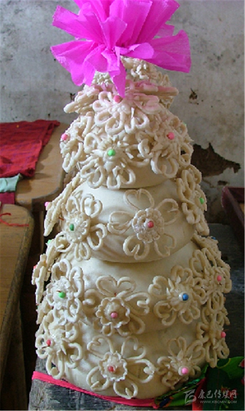 何謂“花饃饃”,顧名思義,就是用面粉做成的一種夾心并模印圖案的薄餅。一般“花饃饃”的厚度約一指厚,直徑為13厘米左右。制作“花饃饃”時,一定要用新打出的本地面粉(用新面意為喜慶豐收)并不加發(fā)酵的老面(主要防止饃饃以及饃饃上的圖案變形),只加少許蘇打以水揉面即可。餡兒是由藏族特有的食品酥油、糌粑、奶渣等拌上紅糖或白糖而成。先將揉好的面粉揉成巴掌大的面坨,把調(diào)好的心子包在面坨內(nèi),然后壓平,盡量使它變成圓形,并在“花饃饃”的最中心粘一小片青綠的蘿卜葉,然后用雕有各種圖案的印板印上圖案。印板圖案多為三條圓圈或藏族美術(shù)中常有的萬吉祥等,圈內(nèi)雕有玉兔、鹿子、獐子吉祥物等,一般是一對玉兔相對而立,或是鹿子休閑躺于青草之上,或是兩朵鮮花對開,或是……再用手將“花饃饃”的周邊勒成各種花邊,并點上幾點食用紅點(紅點表喜慶,如年內(nèi)曾遇喪事則不點紅點)。最后將成形的“花饃饃”置于平鍋底在火上烘成即可。烘好后的“花饃饃”外形呈圓形,象征圓月,“圓月”里有玉兔等吉祥圖,有象征喜慶吉祥的紅,有象征春天的綠,極為鮮麗好看而又香甜味美,叫人垂涎。但做好后不能立即實用,首先要選兩個最大最好的來敬月亮,敬菩薩,要等敬月亮,敬菩薩后,中秋這天才能吃,并伴以水果等物贈送鄰里、親朋。據(jù)說這是為了促進(jìn)友誼,讓大家品嘗共享吉祥。