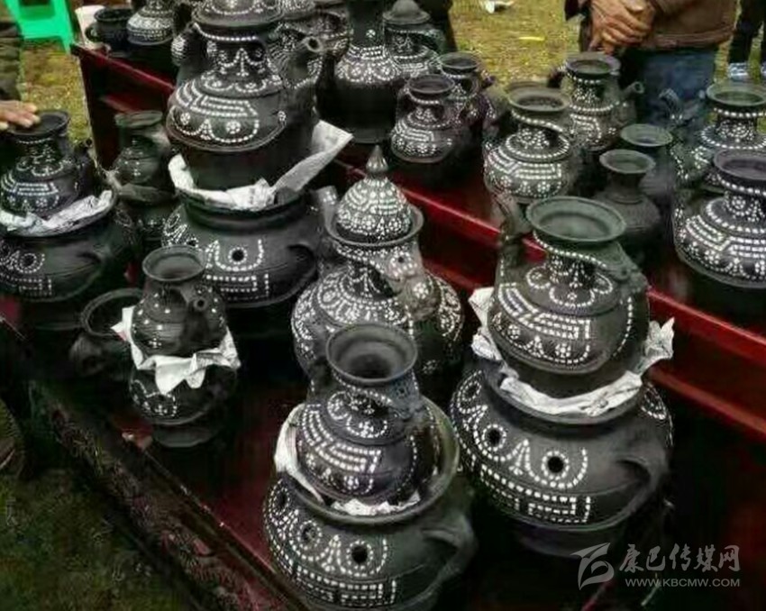 宗教佛事用陶具的制作和用途有明確規(guī)定,當(dāng)?shù)匕傩赵诿磕瓴貧v新年前夕均要制作佛事用具。以戶為單位,每戶3件,其明顯特點是顏色都有別于黑陶,多采用白色作陪襯。制作好的佛事陶具于藏歷新年初五送往寺廟,由寺廟高僧做法事,擇日,在太陽出來前將陶具置于河中深水處,祈禱來年風(fēng)調(diào)雨順、人們幸福安康。