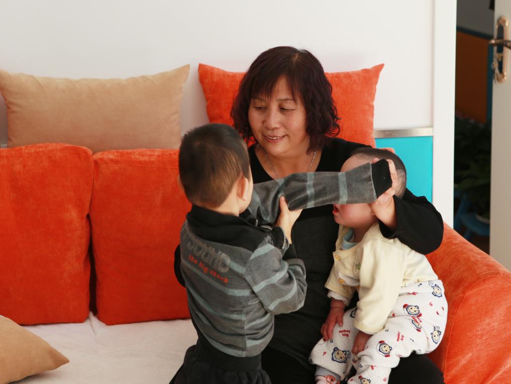 ??2017年11月3日,內蒙古呼和浩特市兒童福利院里,“愛心媽媽”景鳳英抱著兩個孩子。新華社記者 王婧嬙 攝