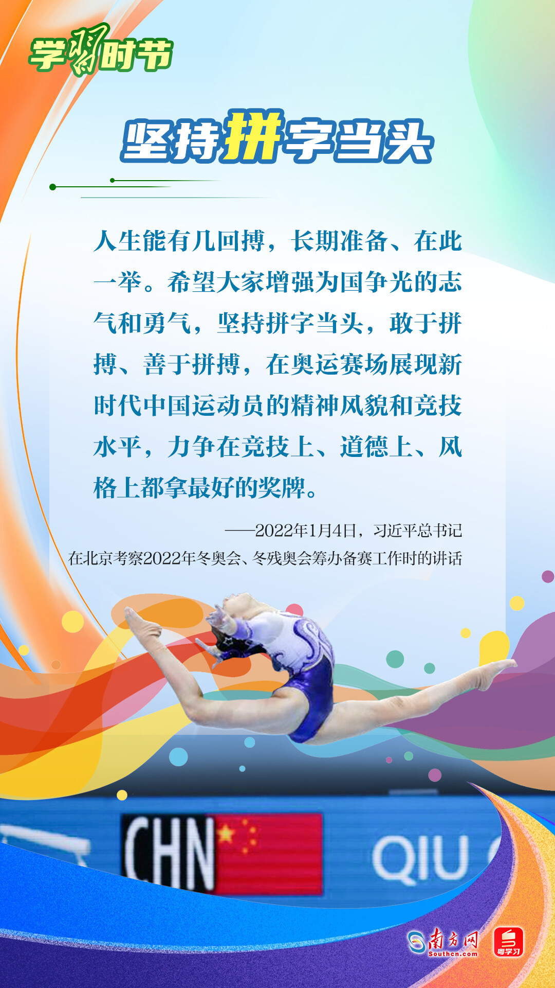 “我們不以勝負(fù)論英雄,同時英雄就要敢于爭先、敢于爭第一。”習(xí)近平總書記曾在不同場合論述奧林匹克精神,深刻闡明了勝與負(fù)、成與敗的辯證關(guān)系,對奧林匹克“更快、更高、更強——更團結(jié)”的格言進(jìn)行詮釋。讓我們一同學(xué)習(xí)習(xí)近平總書記對奧林匹克精神的重要論述,心懷夢想、奮勇拼搏,攜手走向美好明天。
