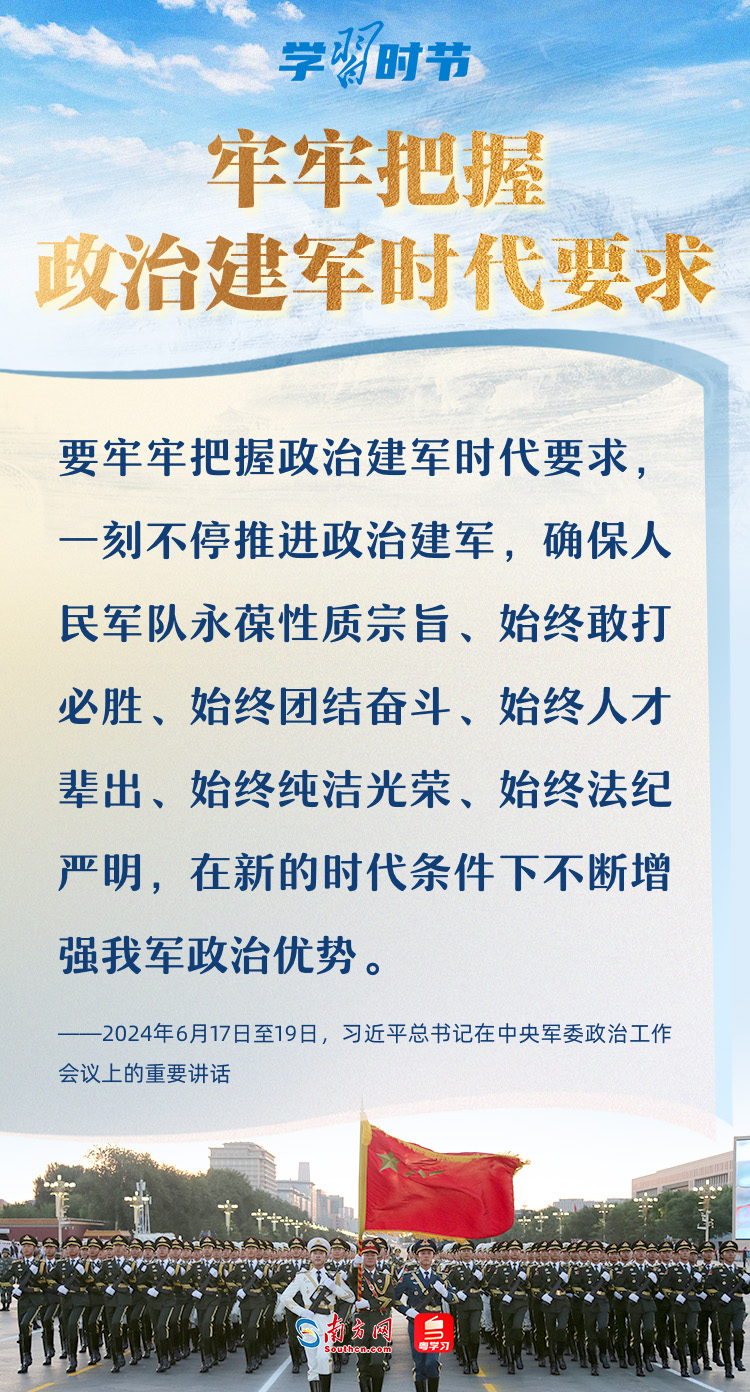 2024年6月,中央軍委政治工作會議在陜西延安召開。習主席強調(diào),要堅持黨對軍隊絕對領(lǐng)導,貫徹落實新時代政治建軍方略,牢牢把握政治建軍時代要求,聚焦打好實現(xiàn)建軍一百年奮斗目標攻堅戰(zhàn),發(fā)揚徹底的自我革命精神,持續(xù)深化政治整訓,鍛造政治堅定、能力過硬的堅強黨組織,鍛造忠誠干凈擔當、堪當強軍重任的高素質(zhì)干部隊伍,為強軍事業(yè)提供堅強政治保證。