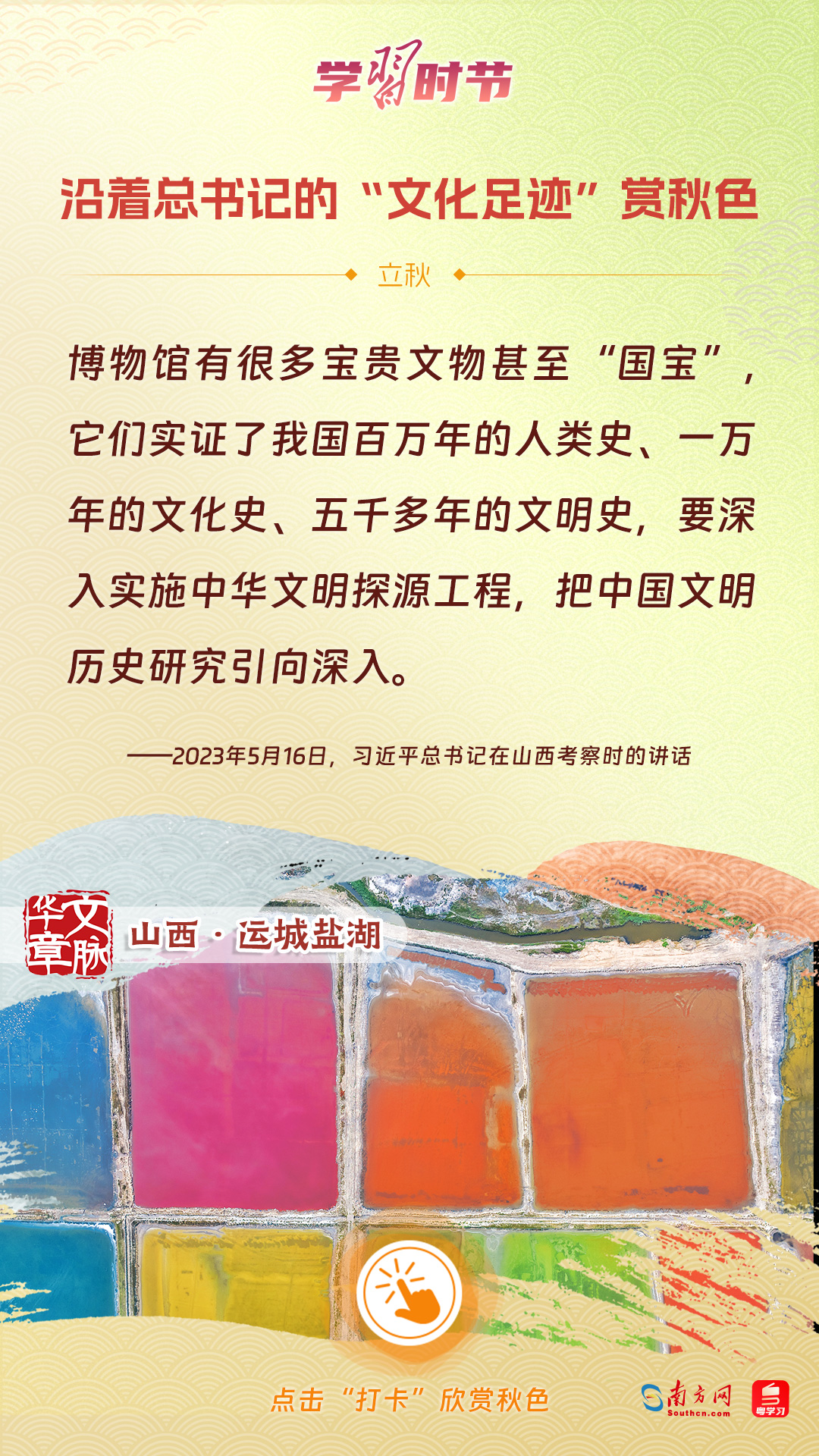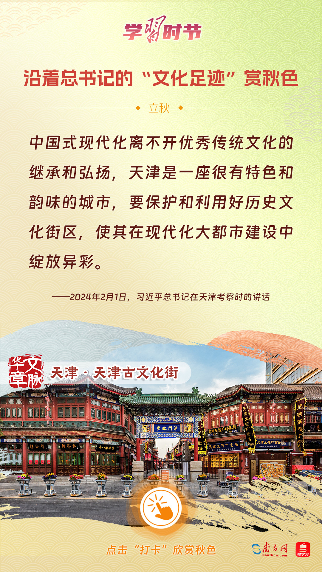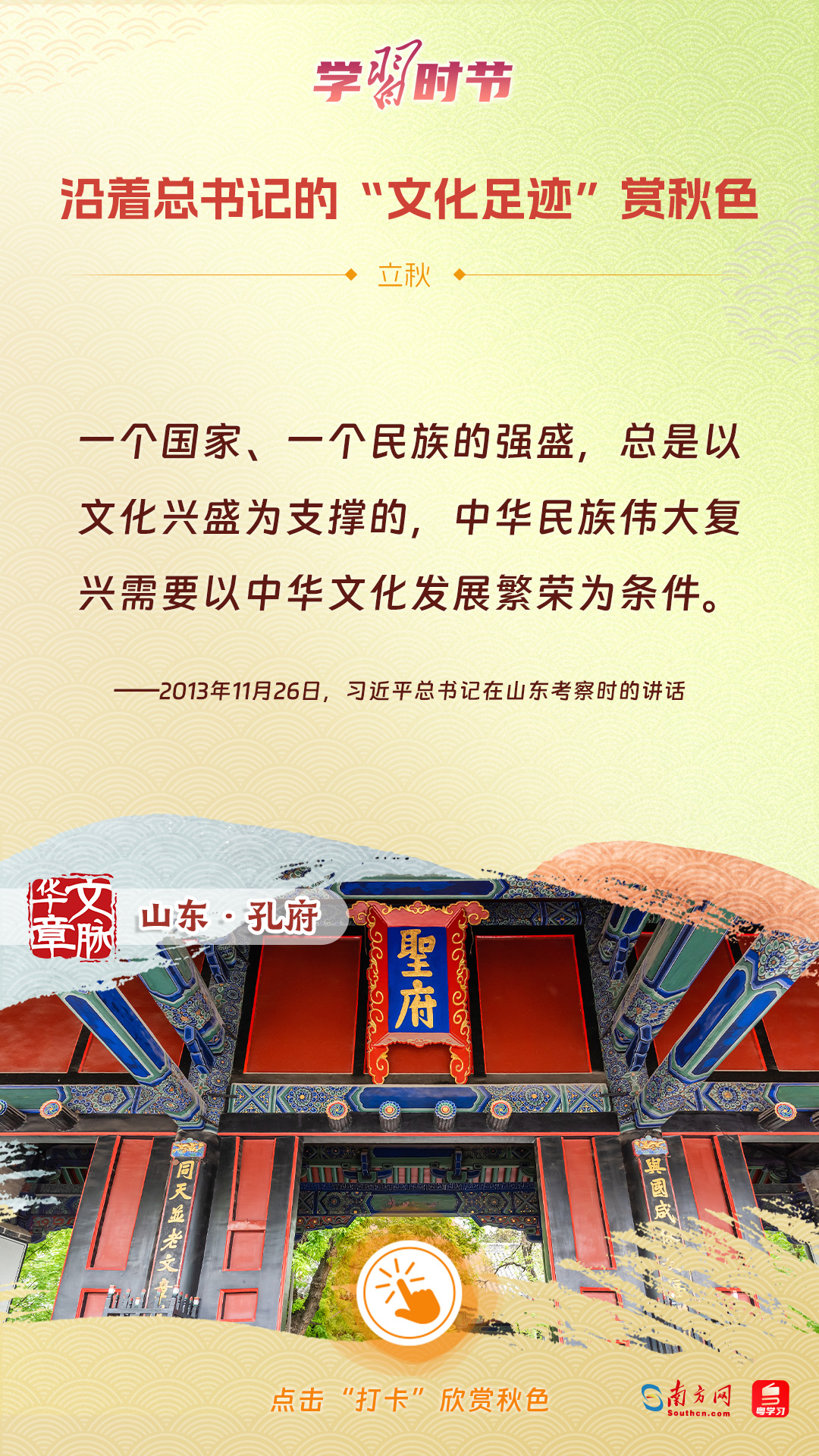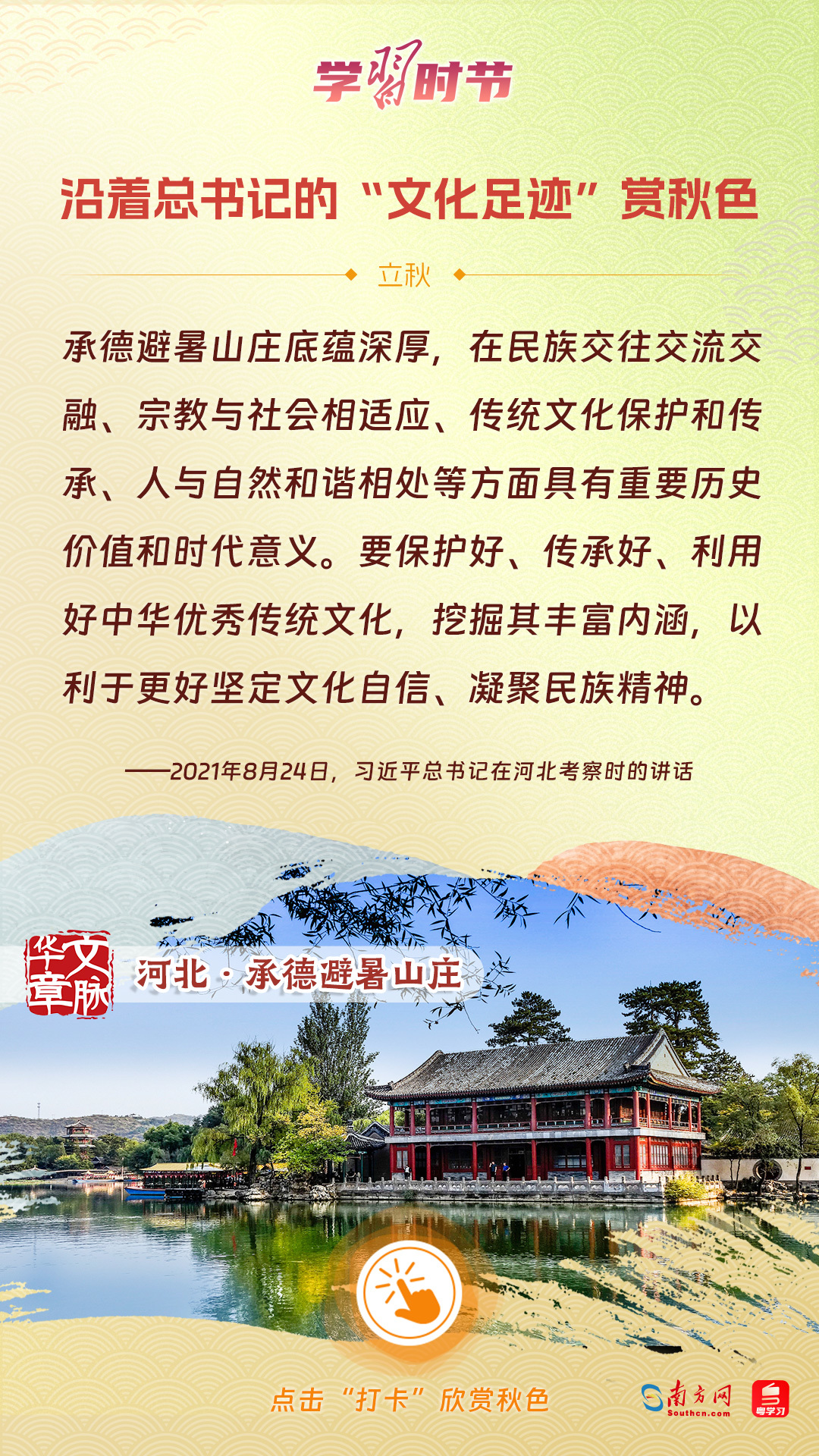 立秋之際,讓我們一起跟隨習(xí)近平總書(shū)記的足跡,學(xué)習(xí)習(xí)近平總書(shū)記關(guān)于文化建設(shè)的重要論述,感受全國(guó)各地文化地標(biāo)古跡的秋意,汲取文化自信的強(qiáng)大力量。