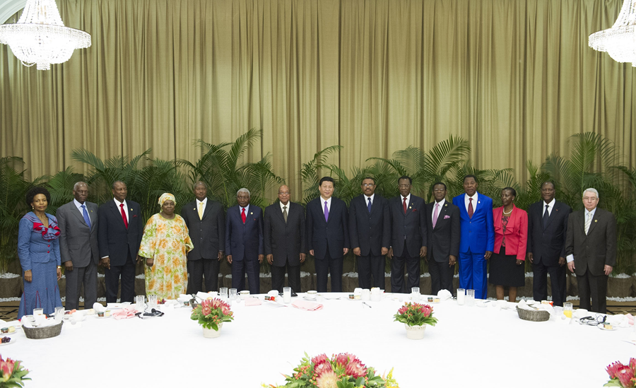 ??圖為2013年3月28日,國(guó)家主席習(xí)近平在南非德班同非洲國(guó)家領(lǐng)導(dǎo)人早餐會(huì)合影。新華社發(fā)