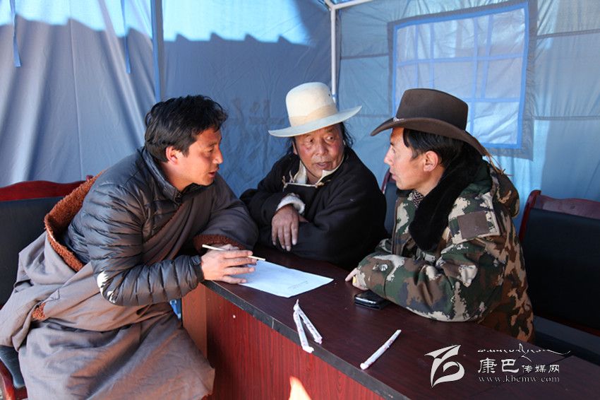 塔公鄉(xiāng)干部與江巴村干部商量救災(zāi)物資發(fā)放。