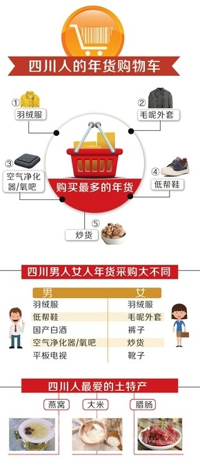 還有幾天就過(guò)年了,你們家買了哪些年貨?近日,電商平臺(tái)阿里巴巴和京東先后推出了年貨大數(shù)據(jù)。從這些數(shù)據(jù)中,我們能看到一個(gè)典型成都人的年貨網(wǎng)絡(luò)購(gòu)物車是這樣的:購(gòu)買最多的年貨還是衣服,其中羽絨服、毛呢外套是成都人的最愛;家電和電子產(chǎn)品愛買空氣凈化設(shè)備和玫瑰金iPhone7手機(jī);食品是山核桃等炒貨,以及國(guó)產(chǎn)白酒。在女性偏好酒水消費(fèi)的排名中,四川女性排名第五。