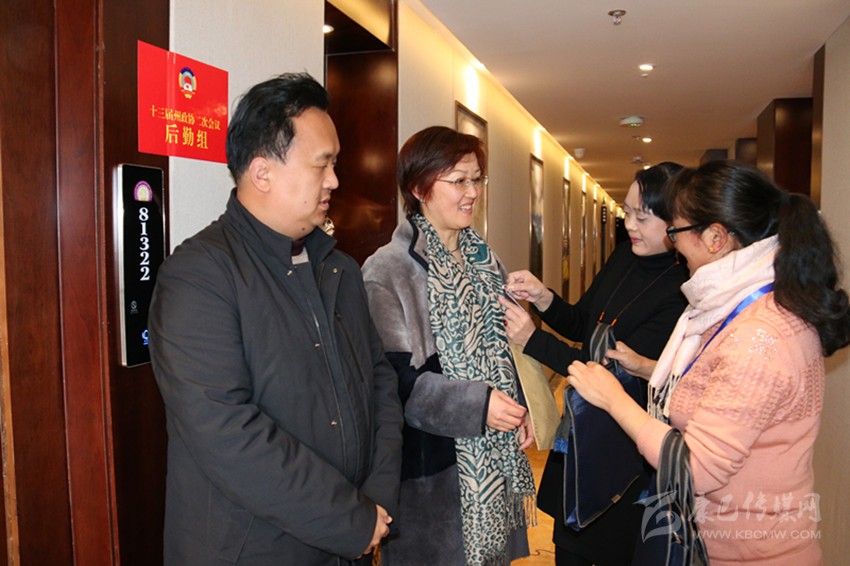 圖為工作人員為報(bào)到委員佩戴出席證。
