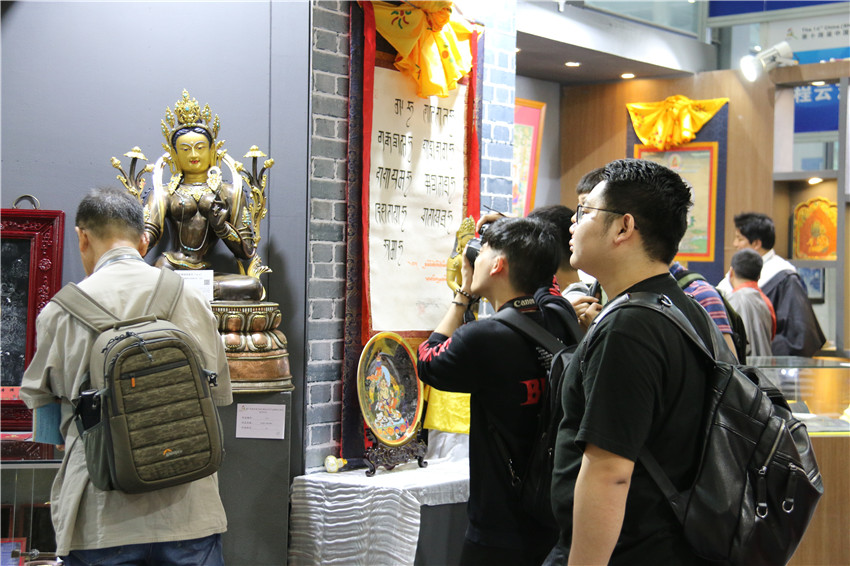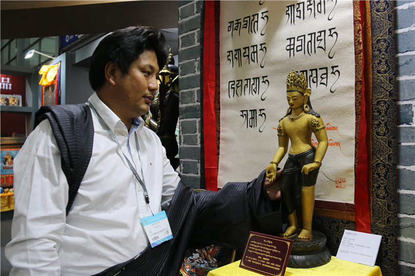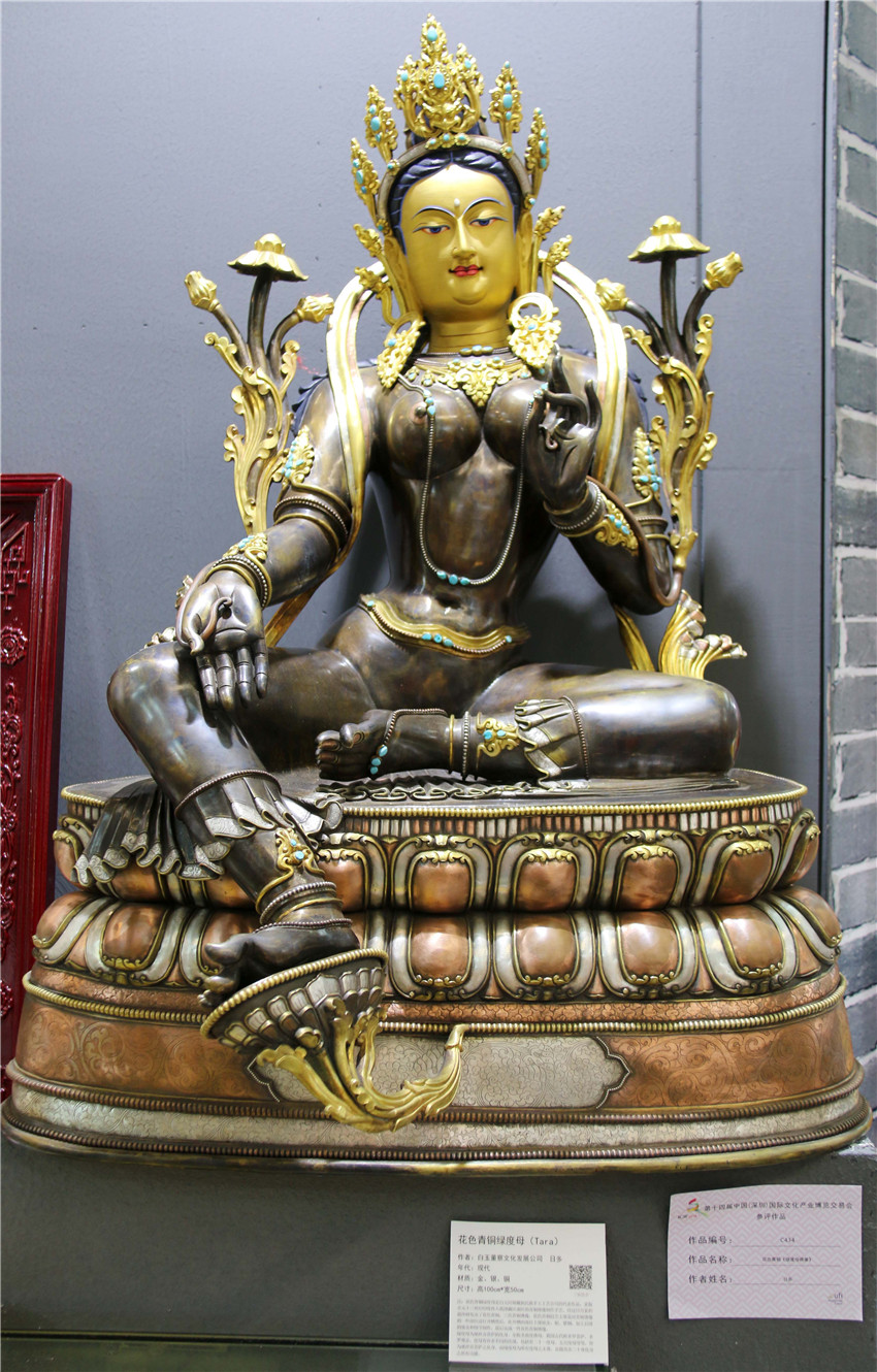 本網(wǎng)訊(記者 宋志勇 文/圖)“這是由什么材料鑄成的物件?”“這件作品的寓意是什么?”“這是一件花色青銅《綠度母佛像》,分別由金、銀、銅鑄成,高100cm、寬50cm,綠度母為觀(guān)世音菩薩的化身?!?月12日是第十四屆中國(guó)(深圳)國(guó)際文化產(chǎn)業(yè)博覽交易會(huì)第三天,甘孜展館迎來(lái)了眾多參觀(guān)者,在館內(nèi)市民正與白玉縣董察文化發(fā)展有限責(zé)任公司董事長(zhǎng)日多一問(wèn)一答。