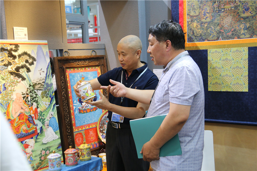 本網訊(記者 宋志勇 文/圖)“我是一次摔壞陶瓷,成就了我和馮建華藝術合作。”這是參加第十四屆中國(深圳)國際文化產業(yè)博覽交易會上,來自爐霍縣華彩文化傳播有限公司參展商付國華這樣說,而在馮建華心里,雖然這是他的鎮(zhèn)館之寶,但他對付國華這位千里迢迢從甘孜藏區(qū)來到景德鎮(zhèn),感到自豪和高興,于是結下了深厚的感情,因此完成了唐卡與陶瓷藝術的完美結合——高溫粉彩瓷板。