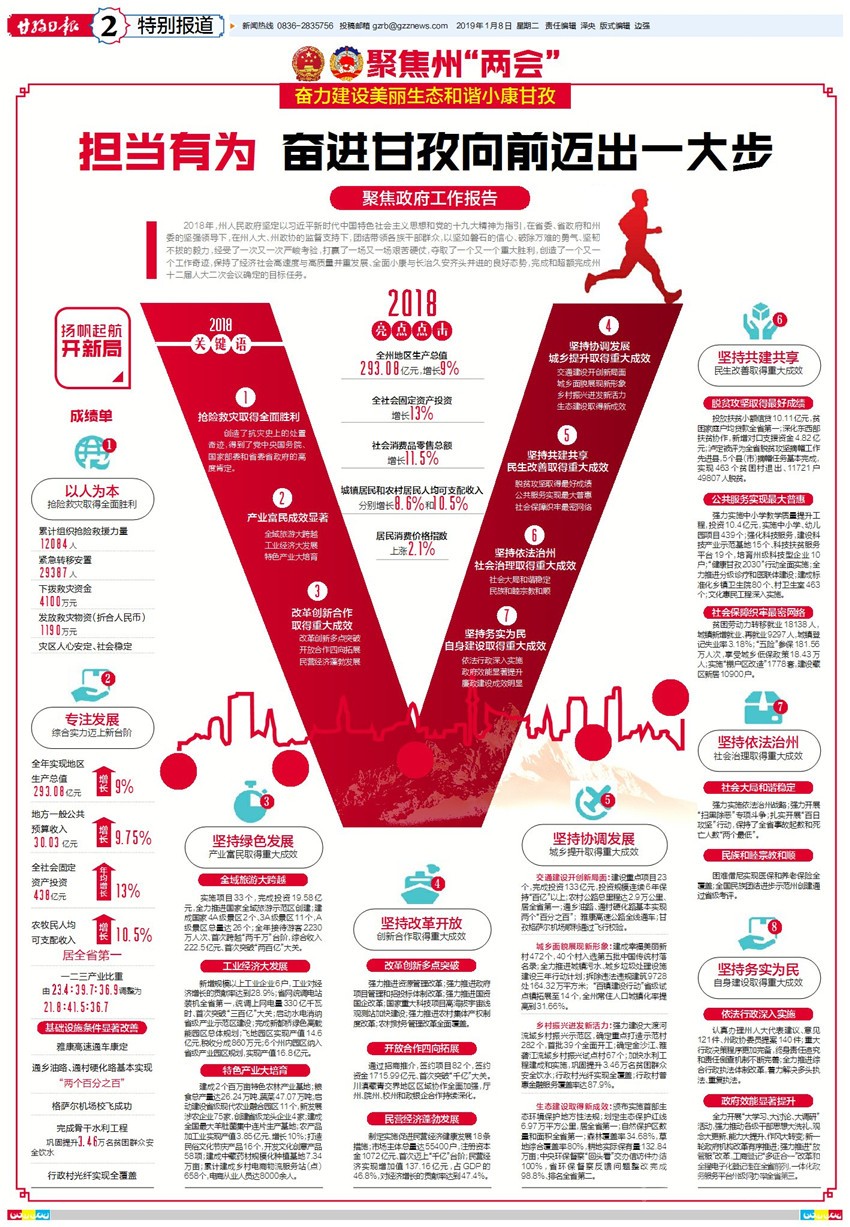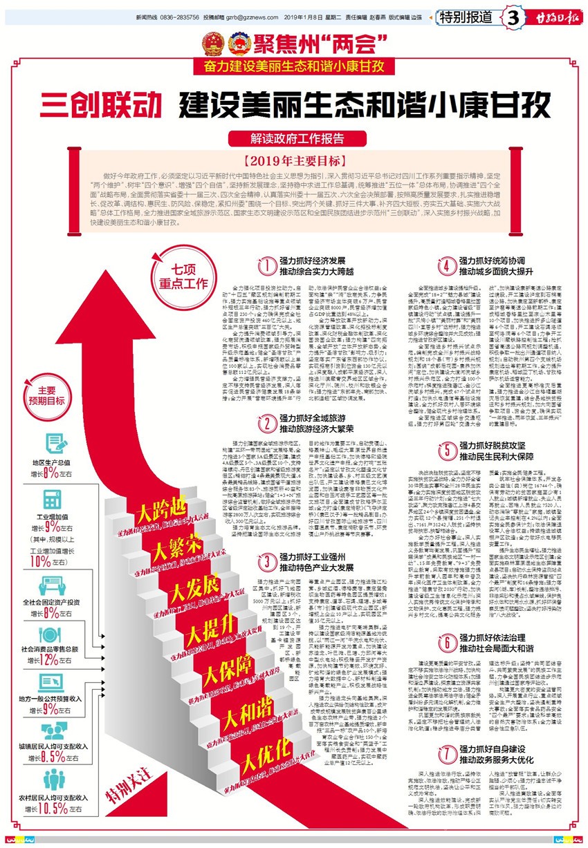 肖友才指出,今年發(fā)展形勢更加復(fù)雜、發(fā)展任務(wù)更加繁重,我們必須緊緊抓住大有可為的重要戰(zhàn)略機(jī)遇期和政策紅利“窗口期”,統(tǒng)籌兼顧、突出重點、突破難點,全力保持經(jīng)濟(jì)社會高速度與高質(zhì)量并重發(fā)展良好態(tài)勢,重點做好以下工作:一是強(qiáng)力抓好經(jīng)濟(jì)發(fā)展,推動綜合實力大跨越。堅持把項目投資作為推動高質(zhì)量發(fā)展的重中之重,全力確保完成全社會固定資產(chǎn)投資460億元以上、地區(qū)生產(chǎn)總值突破“三百億”大關(guān);深化商貿(mào)流通領(lǐng)域改革,強(qiáng)力拓展消費(fèi)市場,健全“圣潔甘孜”產(chǎn)品質(zhì)量標(biāo)準(zhǔn)體系,實現(xiàn)社會消費(fèi)品零售總額112億元以上;堅定不移支持民營經(jīng)濟(jì)發(fā)展,力爭民營經(jīng)濟(jì)市場主體突破6萬戶、民營企業(yè)突破8000戶,民營經(jīng)濟(jì)增加值占GDP比重達(dá)到48%以上;堅持以供給側(cè)結(jié)構(gòu)性改革為主線,強(qiáng)力推動各項改革任務(wù)落地見效。二是強(qiáng)力抓好全域旅游,推動旅游經(jīng)濟(jì)大繁榮。堅定不移實施產(chǎn)業(yè)富民戰(zhàn)略,全力推進(jìn)以全域旅游為核心的生態(tài)優(yōu)先、綠色發(fā)展,強(qiáng)力構(gòu)建“三環(huán)一帶兩濕地”發(fā)展格局,全力打造世界重要旅游目的地和國家全域旅游示范區(qū);堅持把建設(shè)國際生態(tài)文化旅游目的地作為重要工作,全力打響中國最美雪山、中國最美濕地、中國最美草原、中國最美藏寨、中國最美漢子“五張名片”,強(qiáng)力培育生態(tài)文化旅游品牌。三是強(qiáng)力抓好工業(yè)強(qiáng)州,推動特色產(chǎn)業(yè)大發(fā)展。堅定不移實施工業(yè)強(qiáng)州戰(zhàn)略,堅持“優(yōu)先發(fā)展新興產(chǎn)業(yè)、大力發(fā)展農(nóng)特加工產(chǎn)業(yè)、有序發(fā)展電礦產(chǎn)業(yè),大建園區(qū)、建大園區(qū),大建基地、建大基地,大建產(chǎn)業(yè)、建大產(chǎn)業(yè)”思路,強(qiáng)力推進(jìn)產(chǎn)業(yè)向園區(qū)集中;堅持以建設(shè)國家級清潔能源基地為統(tǒng)攬,積極穩(wěn)妥開發(fā)礦產(chǎn)資源,積極發(fā)展戰(zhàn)略性新興產(chǎn)業(yè),強(qiáng)力推進(jìn)電礦向高端集群;堅持以建設(shè)現(xiàn)代高原特色農(nóng)牧業(yè)基地為重點,深入推進(jìn)農(nóng)業(yè)供給側(cè)結(jié)構(gòu)性改革,強(qiáng)力推進(jìn)龍頭向基地集聚。四是強(qiáng)力抓好統(tǒng)籌協(xié)調(diào),推動城鄉(xiāng)面貌大提升。堅定不移實施城鄉(xiāng)提升戰(zhàn)略,堅持“七管齊下”“四態(tài)合一”的思路,做強(qiáng)縣城、做優(yōu)鄉(xiāng)鎮(zhèn)、做美村寨,全面推進(jìn)城鄉(xiāng)建設(shè)提檔升級;堅定不移實施鄉(xiāng)村振興戰(zhàn)略,編制完成全州鄉(xiāng)村振興戰(zhàn)略規(guī)劃和18個縣(市)鄉(xiāng)村振興規(guī)劃,全面推進(jìn)鄉(xiāng)村振興試點示范;堅定不移實施交通先行戰(zhàn)略,強(qiáng)力打好第四輪“交通大會戰(zhàn)”,全面推進(jìn)區(qū)域綜合交通樞紐;高標(biāo)準(zhǔn)編制災(zāi)后重建實施方案和項目清單,強(qiáng)力推進(jìn)金沙江白格堰塞湖災(zāi)后恢復(fù)重建。五是強(qiáng)力抓好脫貧攻堅,推動民生民利大保障。堅定不移實施扶貧攻堅戰(zhàn)略,堅持把脫貧攻堅作為最大的政治責(zé)任、最大的民生工程、最大的發(fā)展機(jī)遇,決戰(zhàn)決勝脫貧攻堅;深入實施教學(xué)質(zhì)量提升工程,深化醫(yī)療衛(wèi)生體制改革,完善公共文化服務(wù)體系,全力辦好社會事業(yè);堅持就業(yè)優(yōu)先,大規(guī)模開展職業(yè)技能培訓(xùn),全面實施全民參保計劃,依法保障退役軍人合法權(quán)益,持續(xù)推進(jìn)城鎮(zhèn)棚戶區(qū)改造,全力做好水電移民安置工作,筑牢社會保障體系;堅定不移實施生態(tài)文明建設(shè)戰(zhàn)略,嚴(yán)格落實“三線一單”制度,強(qiáng)力推進(jìn)國家生態(tài)文明建設(shè)示范區(qū)創(chuàng)建,提升生態(tài)民生福祉。六是強(qiáng)力抓好依法治理,推動社會局面大和諧。堅定不移實施依法治州戰(zhàn)略,深化“三區(qū)”維穩(wěn)體系和依法常態(tài)化治理,深入開展反分裂斗爭,建設(shè)更高質(zhì)量的平安甘孜;堅定不移把社會管理納入法治化軌道,鞏固更加和諧的民族宗教關(guān)系;堅定不移落實安全生產(chǎn)“黨政同責(zé)、一崗雙責(zé)、齊抓共管、失職追責(zé)”責(zé)任制,構(gòu)建更大密度的安全監(jiān)管網(wǎng)絡(luò)。七是強(qiáng)力抓好自身建設(shè),推動政務(wù)服務(wù)大優(yōu)化。堅持依憲施政、依法治政,自覺運(yùn)用法治思維和法治方式推進(jìn)政府工作,堅決讓公平和正義成為常態(tài);完成新一輪政府機(jī)構(gòu)改革,形成職責(zé)明確、依法行政的政府治理體系,堅決用實干和效率贏得民心;全面落實從嚴(yán)治黨主體責(zé)任,把經(jīng)濟(jì)社會發(fā)展與黨風(fēng)廉政建設(shè)同部署、同安排、同考核,堅決把紀(jì)律和規(guī)矩挺在前面。