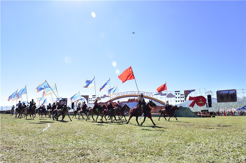 “四山旗似晴霞卷,萬馬蹄如驟雨來”。上午十點(diǎn),石渠縣四個(gè)片區(qū)組成的四個(gè)馬隊(duì)方陣高舉印有“世界最美濕地”“千年唐蕃古道”“石刻藝術(shù)王國”“吉祥太陽部落”字樣的四色彩旗,眾星拱月般簇?fù)碇腥A人民共和國國旗和慶祝中華人民共和國成立70周年活動(dòng)標(biāo)識(shí),策馬入場,拉開了2019中國·石渠—太陽部落帳篷狂歡節(jié)的帷幕。