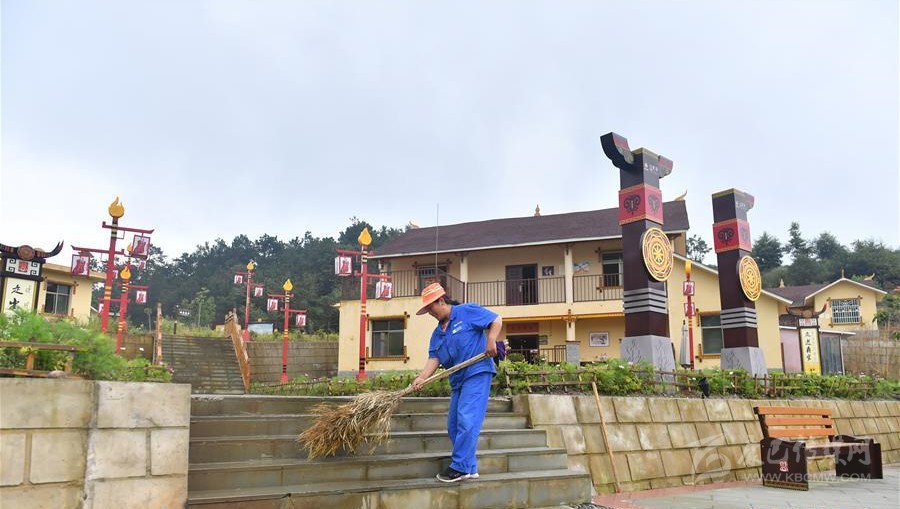 9月7日,一名在景區(qū)工作的彝海村村民在清掃小廣場。