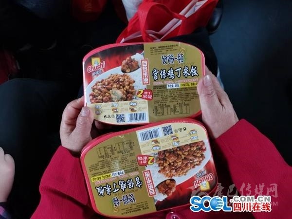18日中午12時(shí), 列車出發(fā)2小時(shí)后,巴中恩陽人鄔兵領(lǐng)到了來自家鄉(xiāng)的午餐——一盒自熱米飯,配菜是宮保雞丁?!安诲e(cuò)不錯(cuò),今年不用吃方便面了。”端上米飯的鄔兵笑了笑。