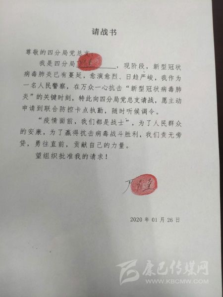 四川新聞網成都1月31日訊(記者 文驥 攝影報道) “疫情面前,我們都是戰(zhàn)士,為了人民群眾的安康,為了贏得抗擊病毒戰(zhàn)斗勝利,我們責無旁貸……”尹彥奎是成都交警四分局的一名黨員交警,1月26日,他向分局黨總支遞交了一份請戰(zhàn)書,還按上了手印。