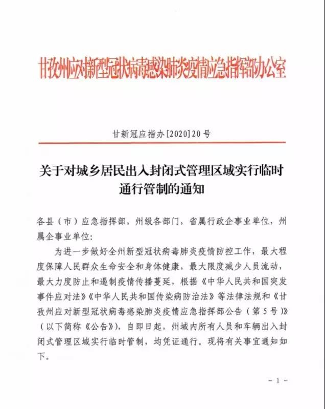 為進(jìn)一步做好全州新型冠狀病毒肺炎疫情防控工作,最大程度保障人民群眾生命安全和身體健康,最大限度減少人員流動(dòng)最大力度防止和遏制疫情傳播蔓延,根據(jù)《中華人民共和國突發(fā)事件應(yīng)對(duì)法》《中華人民共和國傳染病防治法》等法律法規(guī)和《甘孜州應(yīng)對(duì)新型冠狀病毒感染肺炎疫情應(yīng)急指揮部公告(第5號(hào))》(以下簡稱《公告》),自即日起,州域內(nèi)所有人員和車輛出入封閉式管理區(qū)域?qū)嵭信R時(shí)管制,均憑證通行。現(xiàn)將有關(guān)事宜通知如下。