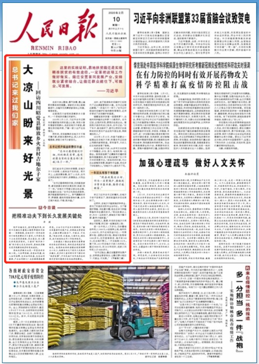 2月10日出版的《人民日?qǐng)?bào)》,在頭版刊登了《大涼山盼來好光景》的報(bào)道,聚焦四川昭覺縣解放鄉(xiāng)火普村易地扶貧搬遷,村民不等不靠不要,積極發(fā)展種養(yǎng)業(yè),彝家兒女奔向充滿希望的新生活。