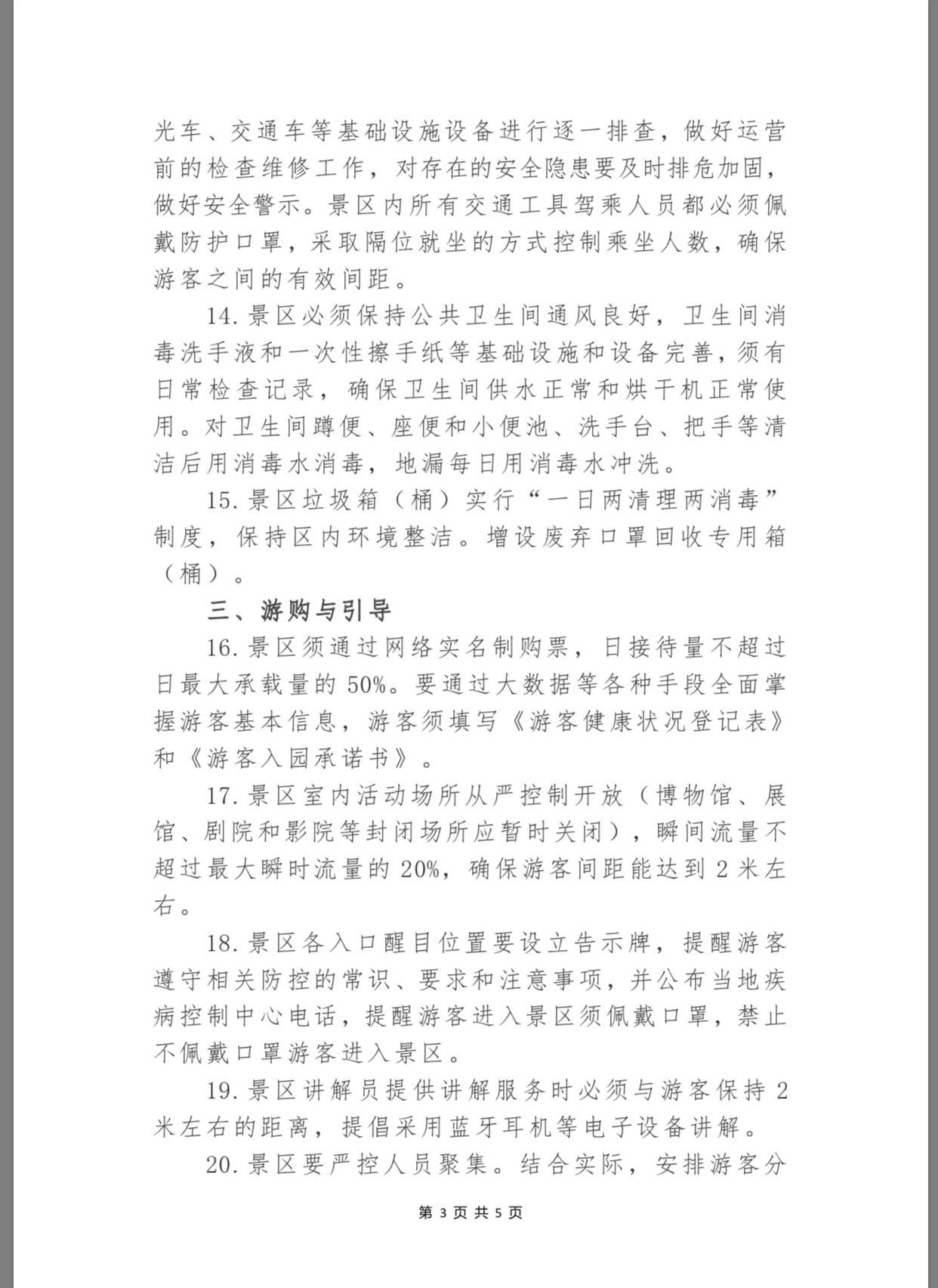 保障游客安全事無巨細(xì)。《指南》提出,景區(qū)須通過網(wǎng)絡(luò)實(shí)名制購票,日接待量不超過日最大承載量的50%。景區(qū)要通過大數(shù)據(jù)等各種手段全面掌握游客基本信息,游客須填寫《游客健康狀況登記表》和《游客入園承諾書》。景區(qū)室內(nèi)活動(dòng)場(chǎng)所從嚴(yán)控制開放(博物館、展館、劇院和影院等封閉場(chǎng)所應(yīng)暫時(shí)關(guān)閉),瞬間流量不超過最大瞬時(shí)流量的20%,確保游客間距能達(dá)到2米左右。此外,景區(qū)講解員提供講解服務(wù)時(shí)必須與游客保持2米左右的距離,提倡采用藍(lán)牙耳機(jī)等電子設(shè)備講解,并嚴(yán)控人員聚集,結(jié)合實(shí)際,安排游客分時(shí)段、間隔入園,實(shí)行分散式游覽。