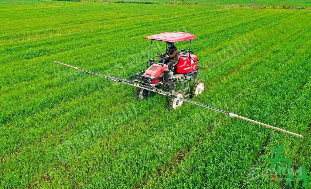 成都市青白江區(qū)彌牟鎮(zhèn)的智農(nóng)農(nóng)機專業(yè)合作社,工人正操作自走式噴桿噴霧機在麥田里打藥。