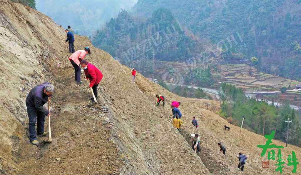巴中市南江縣紅光鎮(zhèn)石寨村村民帶著口罩在開墾的荒坡地上開溝壘廂、覆蓋地膜,準備栽植茶苗。