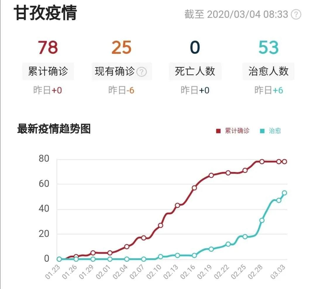 截至3月3日24時,我州累計報告確診病例78例,累計治愈出院53人(道孚縣48人、康定市2人、色達縣2人、稻城縣1人),其余25人均在定點醫(yī)院隔離治療,203名密切接觸者正在接受醫(yī)學觀察。我州道孚縣連續(xù)5天無確診病例報告,其余17個縣(市)連續(xù)29天無確診病例報告。各縣(市)確診病例情況表疫情實時追蹤(截至2020年3月3日24時)縣(市)累計病例新增病例道孚縣730康定市20色達縣20稻城縣10溫馨提示: