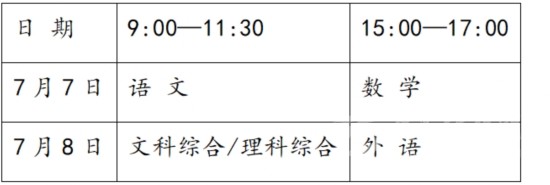 全省一類模式高考于7月7—7月9日統(tǒng)一組織進(jìn)行。各科目考試時(shí)間(北京時(shí)間)安排如下: