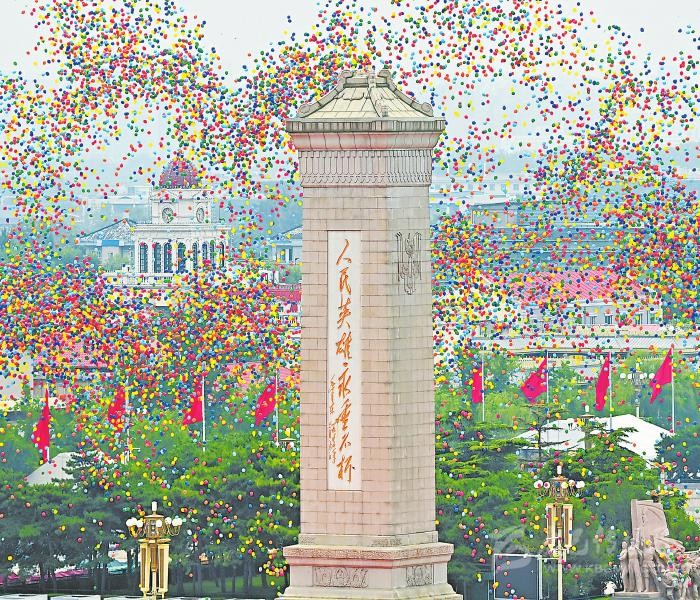 天安門城樓燈火璀璨,廣場上慶祝大會的準備工作緊鑼密鼓。三軍儀仗隊、解放軍聯(lián)合軍樂團,還有北京各高校學(xué)生組成的合唱團,正在進行最后的排練。