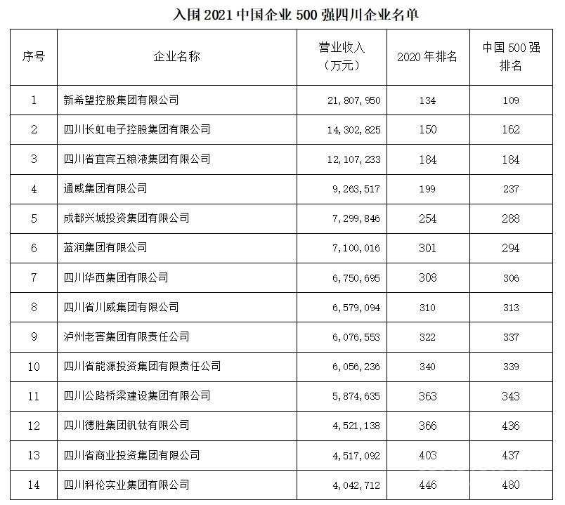 2021年四川有14家四川企業(yè)入圍中國企業(yè)500強(qiáng),較上年減少1家。新希望控股集團(tuán)有限公司以21,807,950萬元的營收成為進(jìn)入中國500強(qiáng)的四川企業(yè)首位,總排名109位,比去年上升25位。其余入圍企業(yè)名單如下。