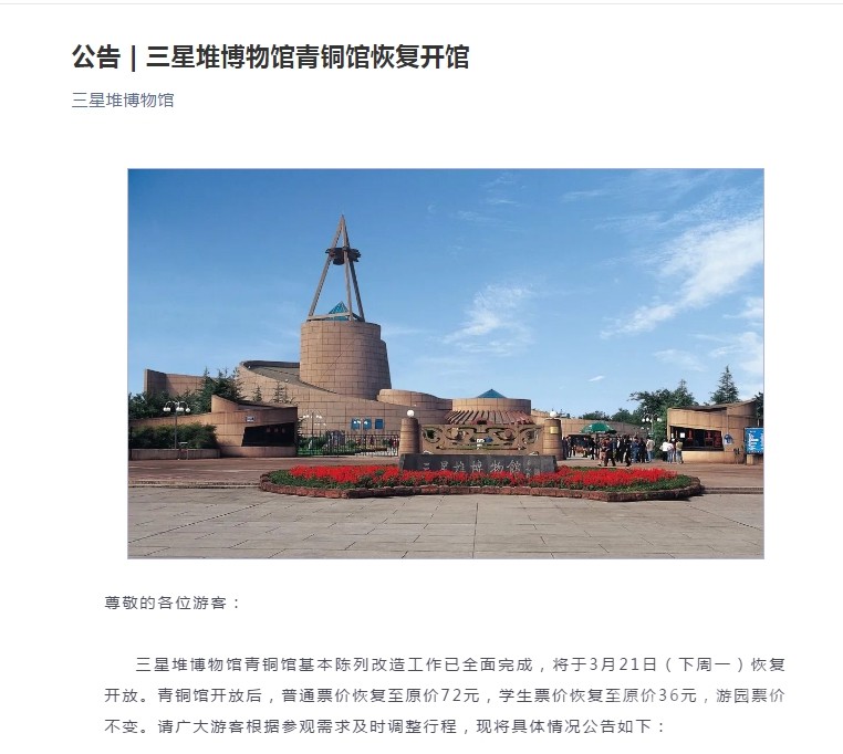 三星堆博物館青銅館基本陳列改造工作已全面完成,將于3月21日(下周一)恢復開放。青銅館開放后,普通票價恢復至原價72元,學生票價恢復至原價36元,游園票價不變。請廣大游客根據(jù)參觀需求及時調(diào)整行程,現(xiàn)將具體情況公告如下: